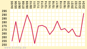 Wie viele Punkte man sich im Laufe der Saison ertippen musste um am Ende als kicktip.de-Meister da zu stehen, seht ihr rechts. |